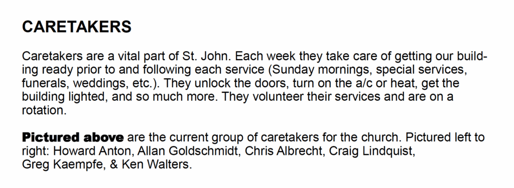 St. John grew numerically from the 1950s to the 1970s. Many young families migrated to West St. Louis County helping the congregation to expand its programs and ministries. By the 1980s, the congregation had over 1000 members and an estimated worship attendance of 400 people. This was supported by the two strong pastorates of Rev. Paul Wobus (1922-1969) and Rev. Dr. Richard Brandon (1970-2005).