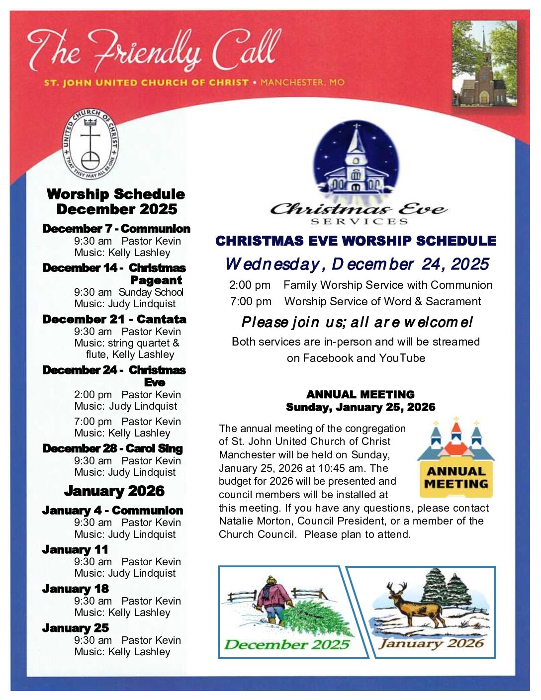 For those interested in membership, the pastors are willing to offer small group sessions or individual meetings. This can be at the convenience of both the prospective member(s) and pastor(s). People will learn about St. John (i.e. history, ministries, etc.), and have a chance to ask questions. The hope is that people will gather enough information to make an informed decision about whether or not to join this community of believers. When people are ready to commit to church membership, we will have a special moment in worship to recognize this reception. Should you want to know more, please feel free to contact the church office.
